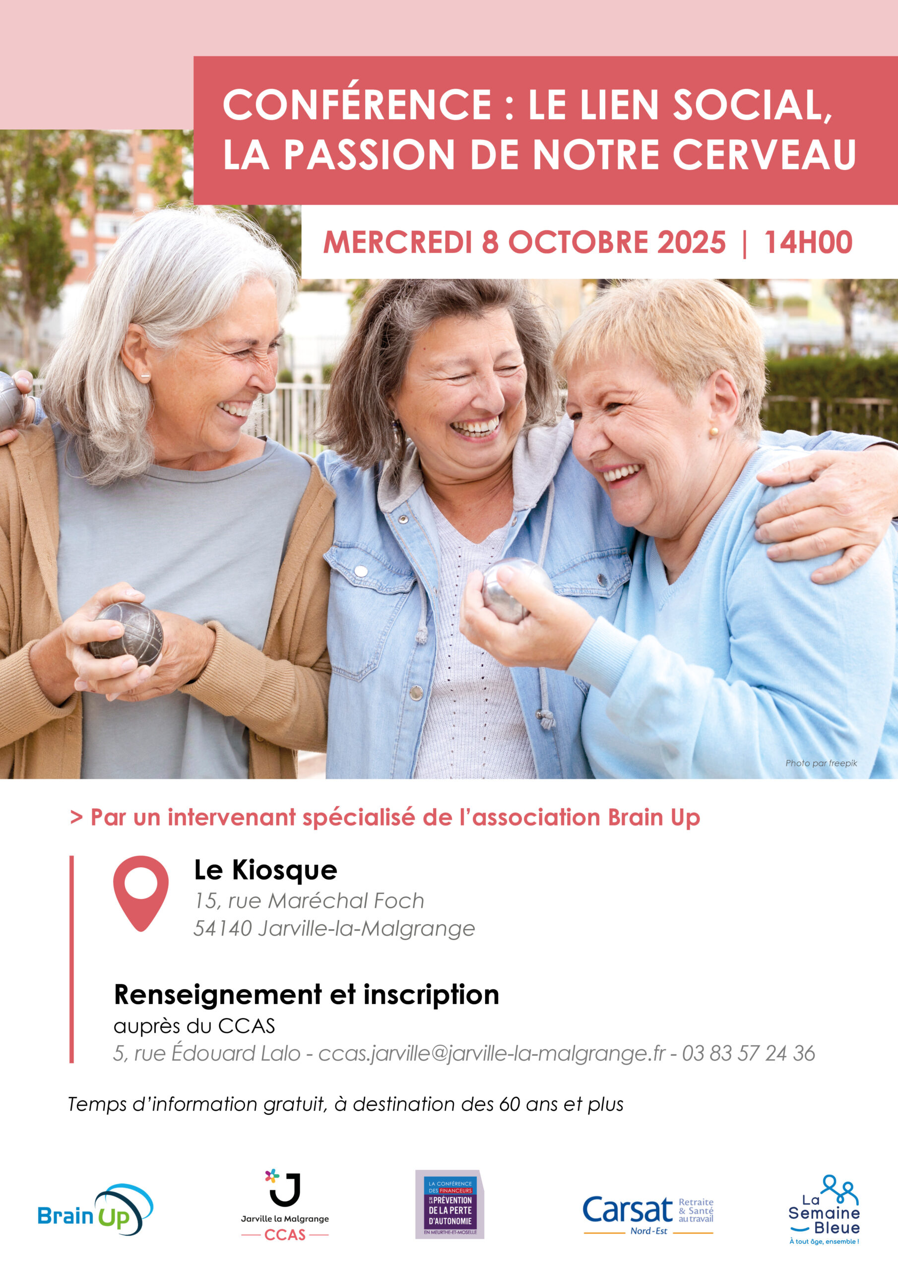 Dans le cadre de la Semaine Bleue, la ville et le Centre Communal d’Action Sociale de Jarville-la-Malgrange, en lien avec Brain Up, vous invitent à une conférence intitulée « Le lien social, la passion de notre cerveau » .